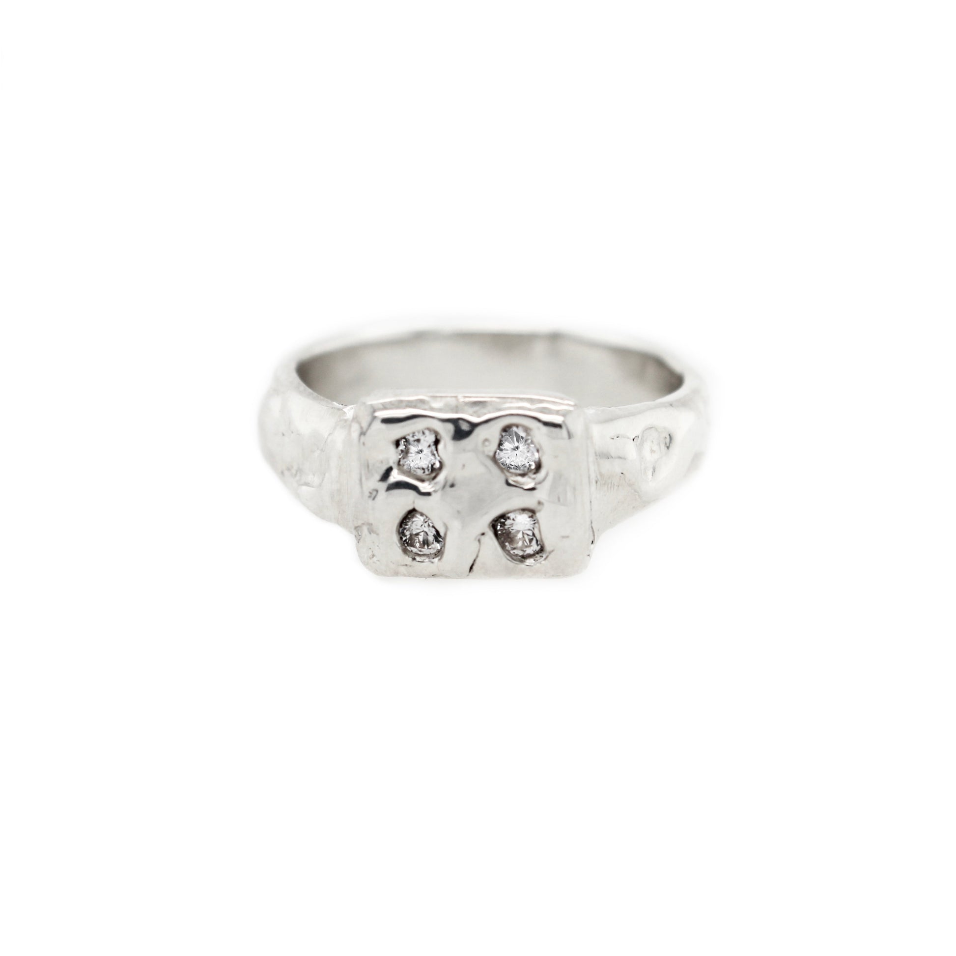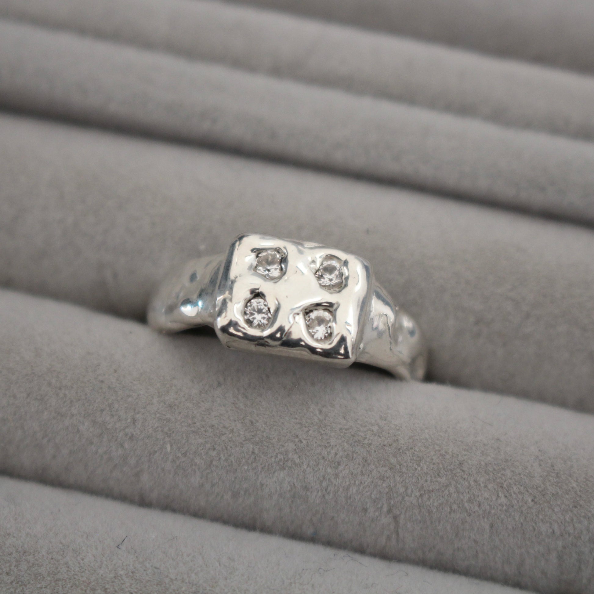 The dice ring is handmade with four lab grown white sapphires. Available in sterling silver or solid 9ct gold.