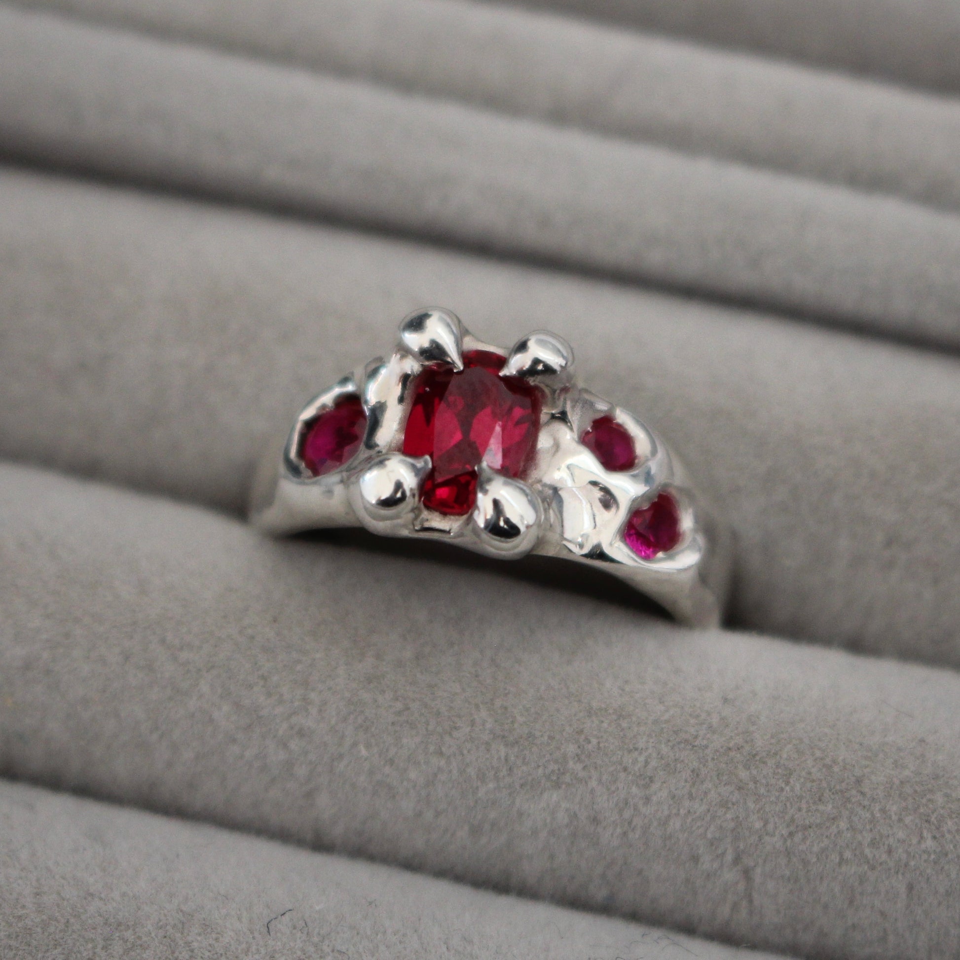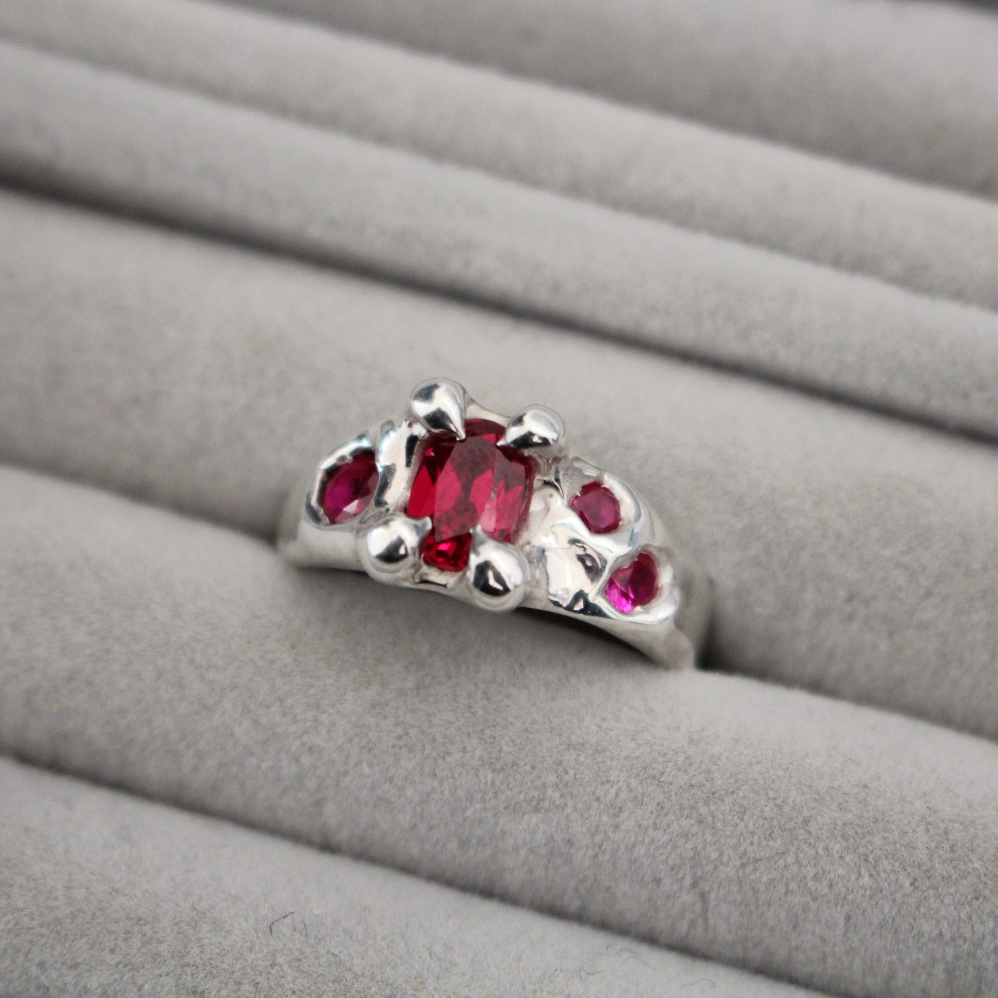 The fang ring is handmade with four lab grown rubies and is available in sterling silver or solid 9ct gold.