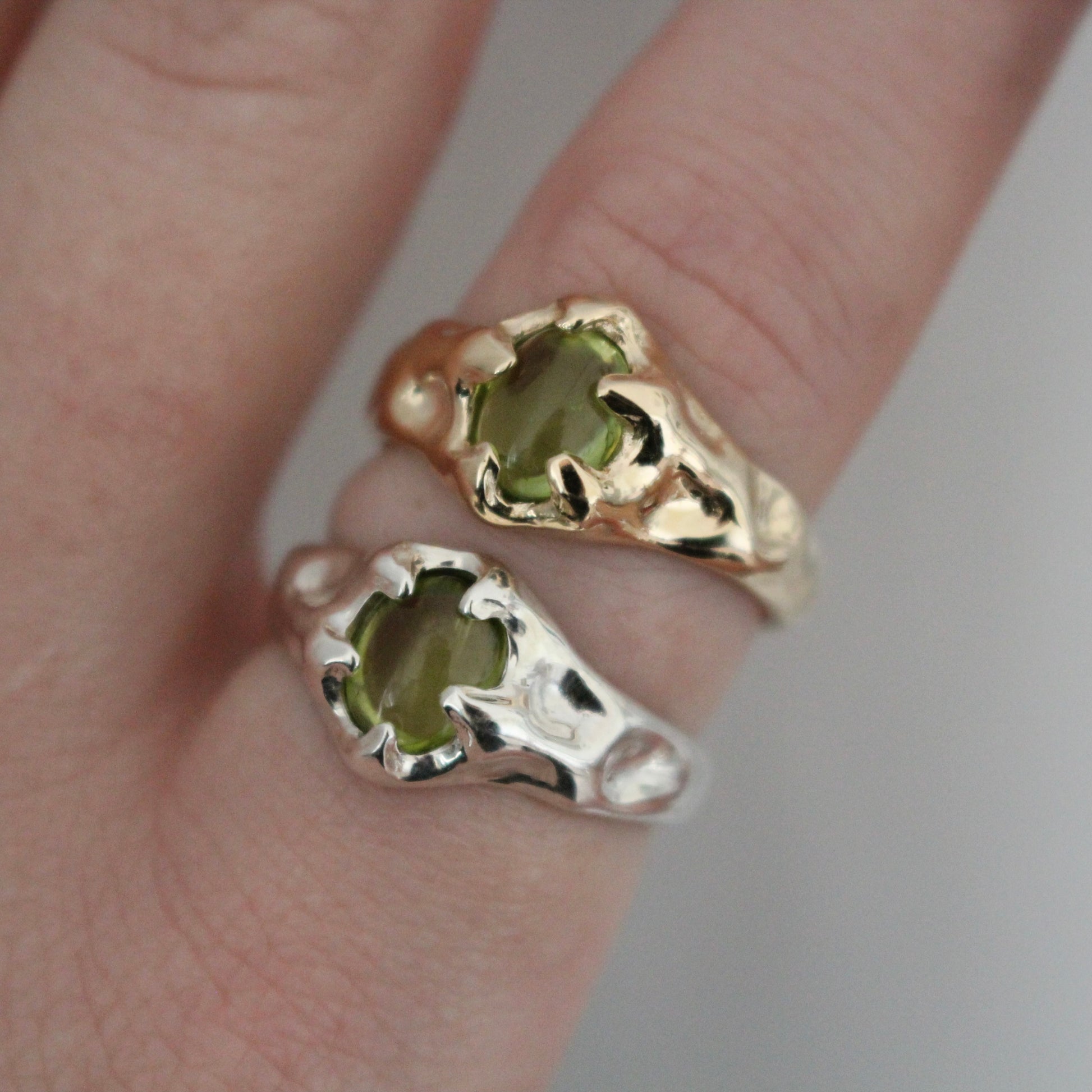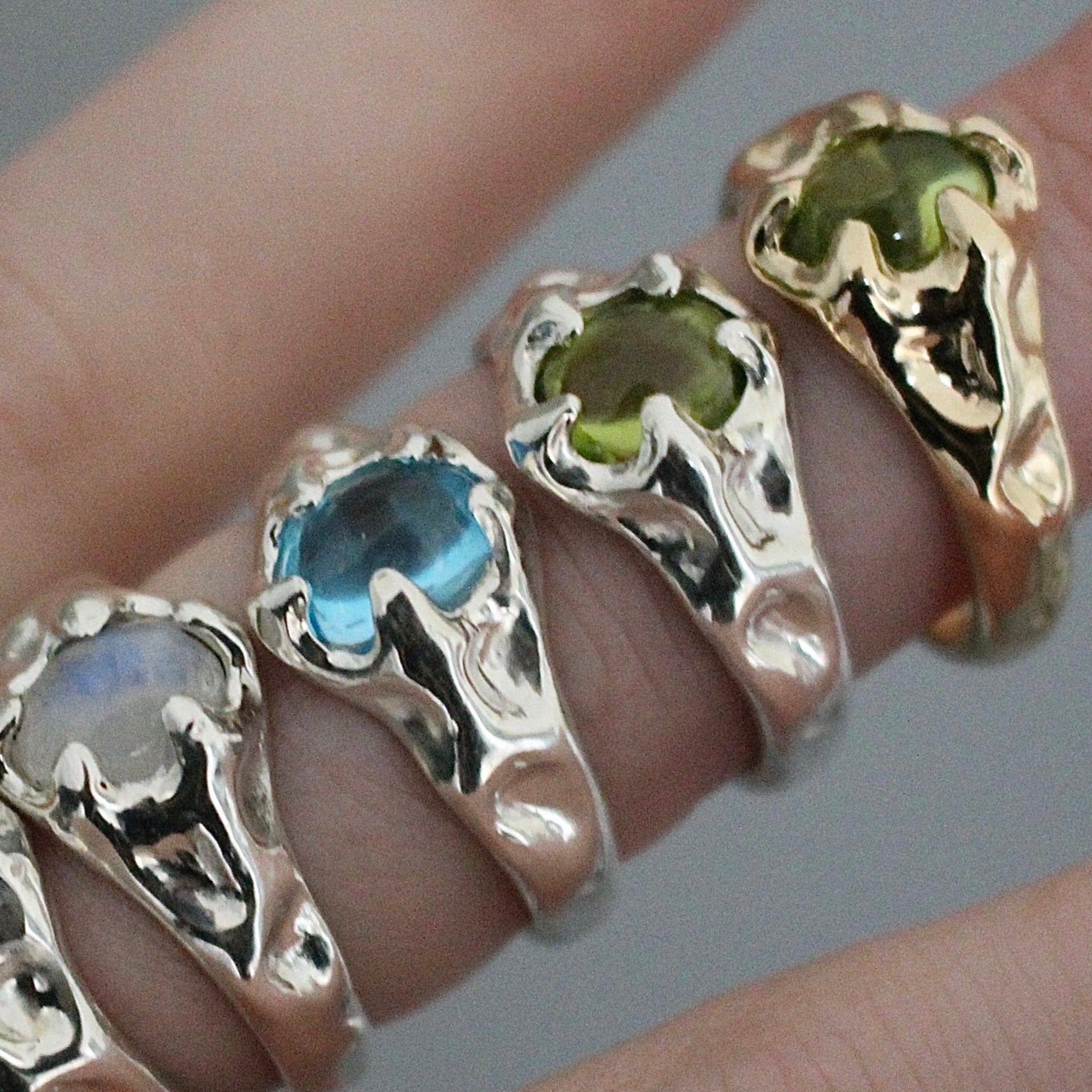 The glow ring has a choice of natural moonstone, topaz or peridot set in sterling silver or solid 9ct gold. If you would like to customise this design with another stone option please reach out.