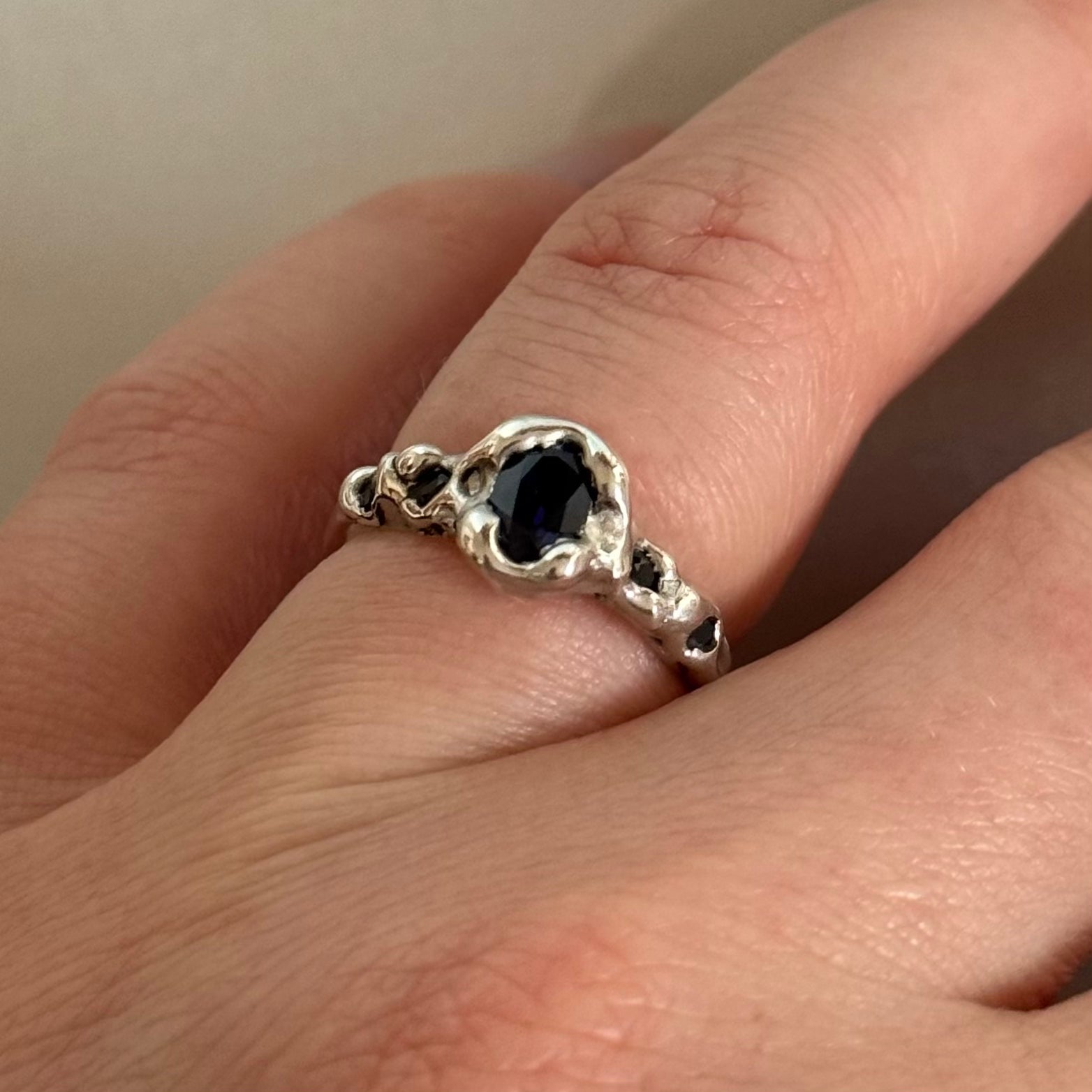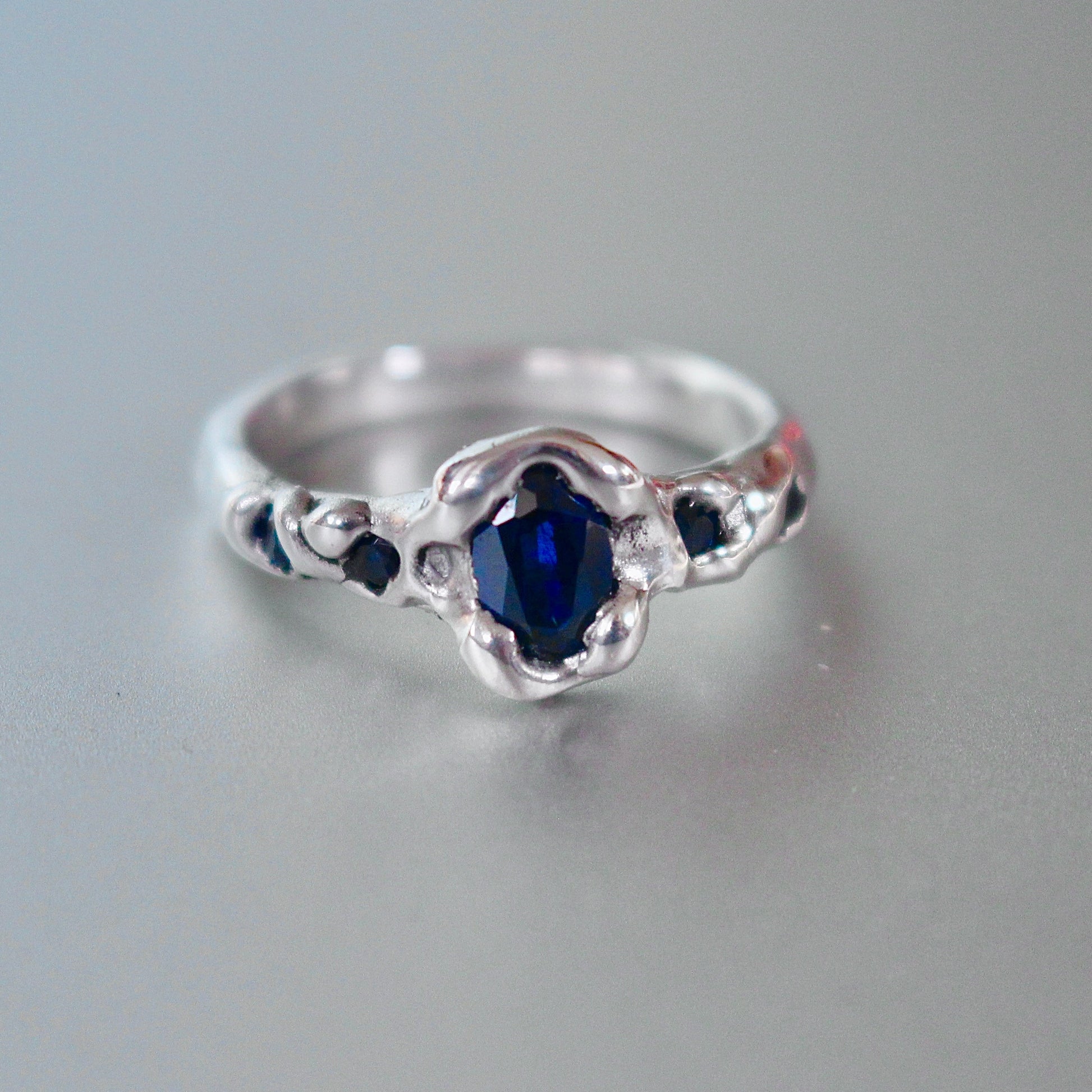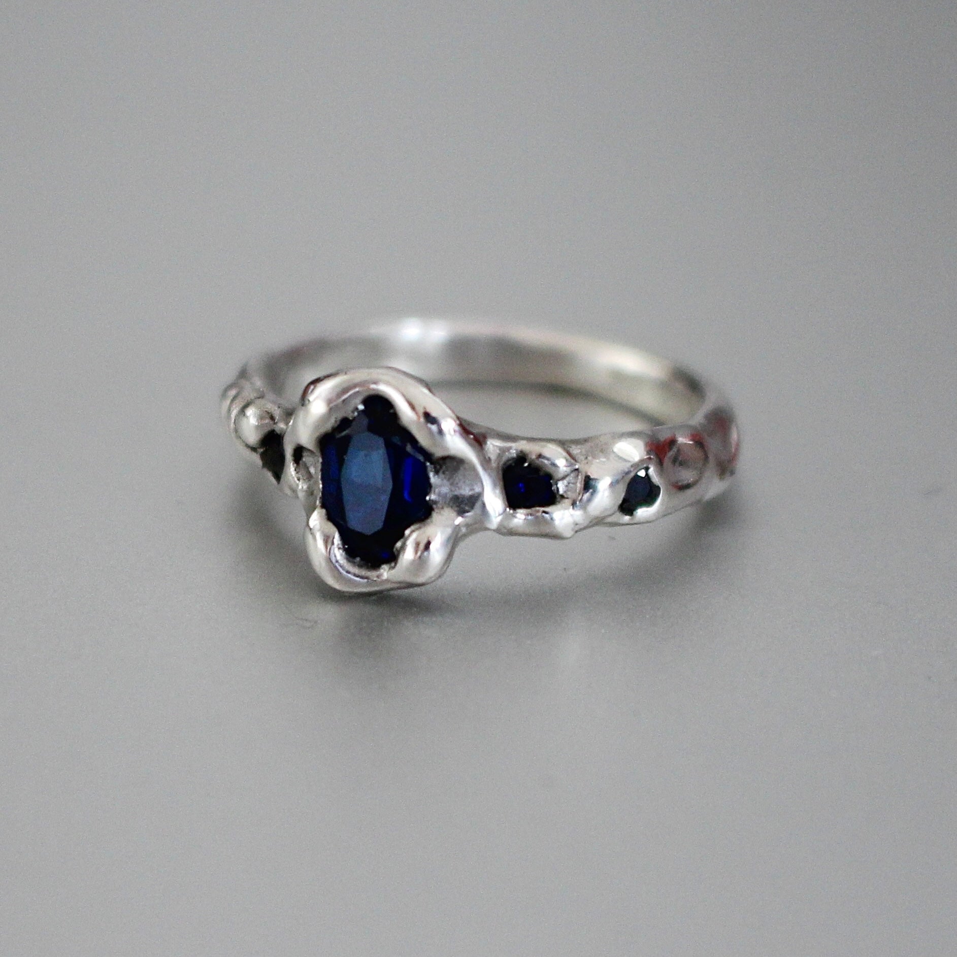 Handmade sterling silver ring with five lab grown sapphires.