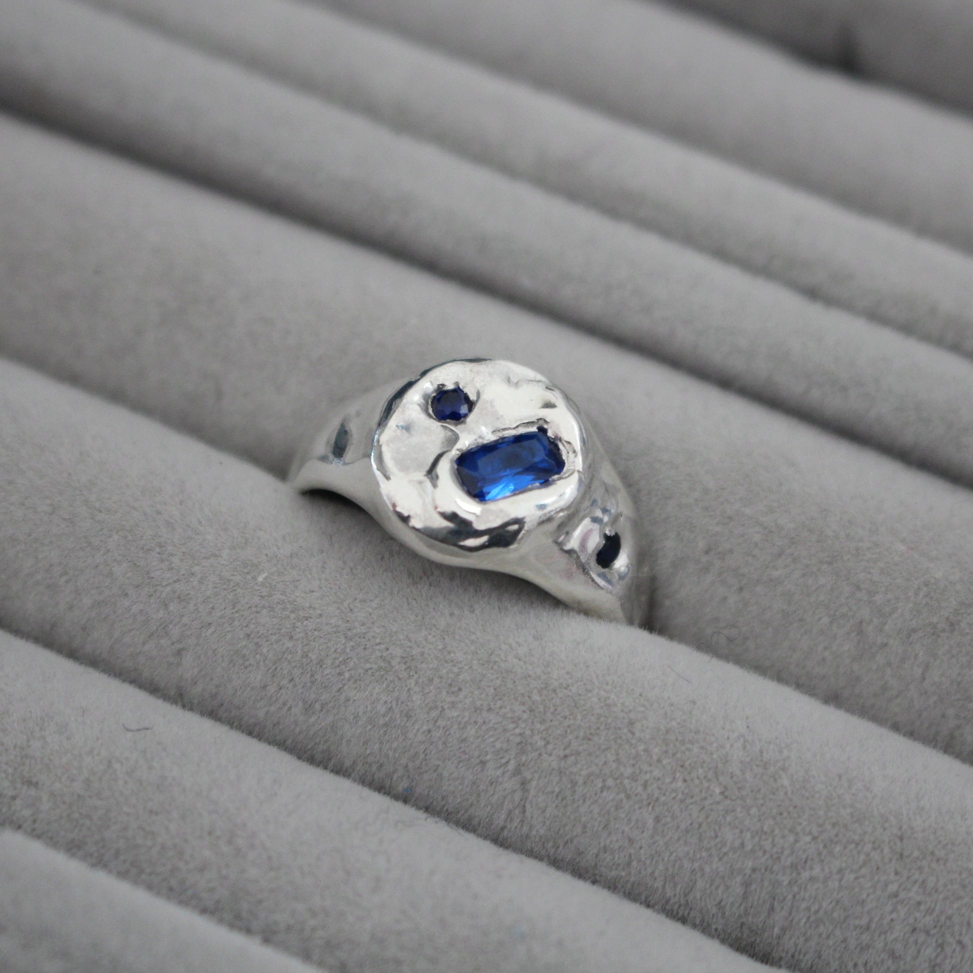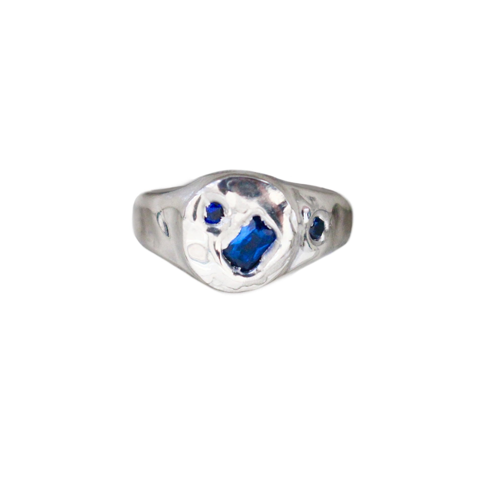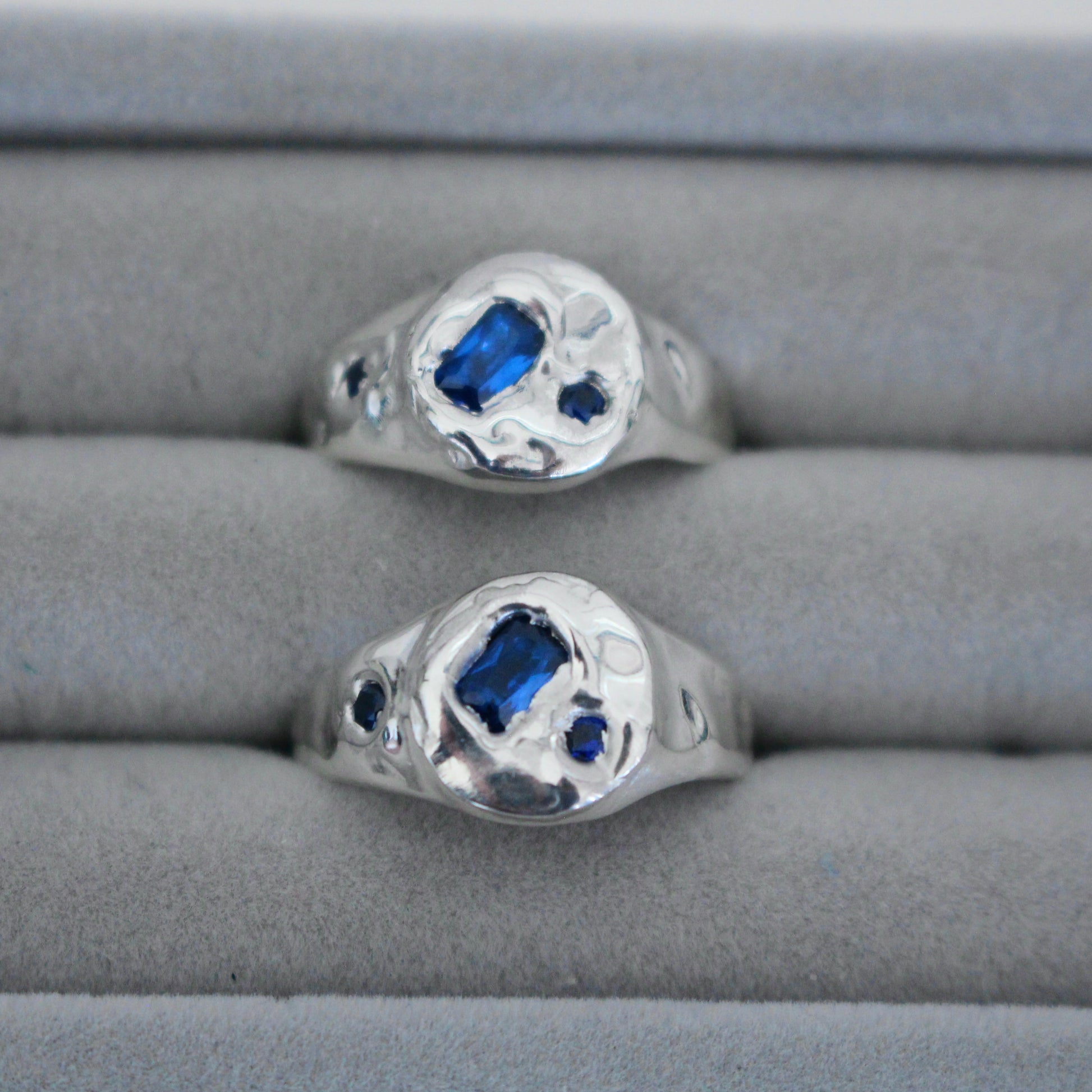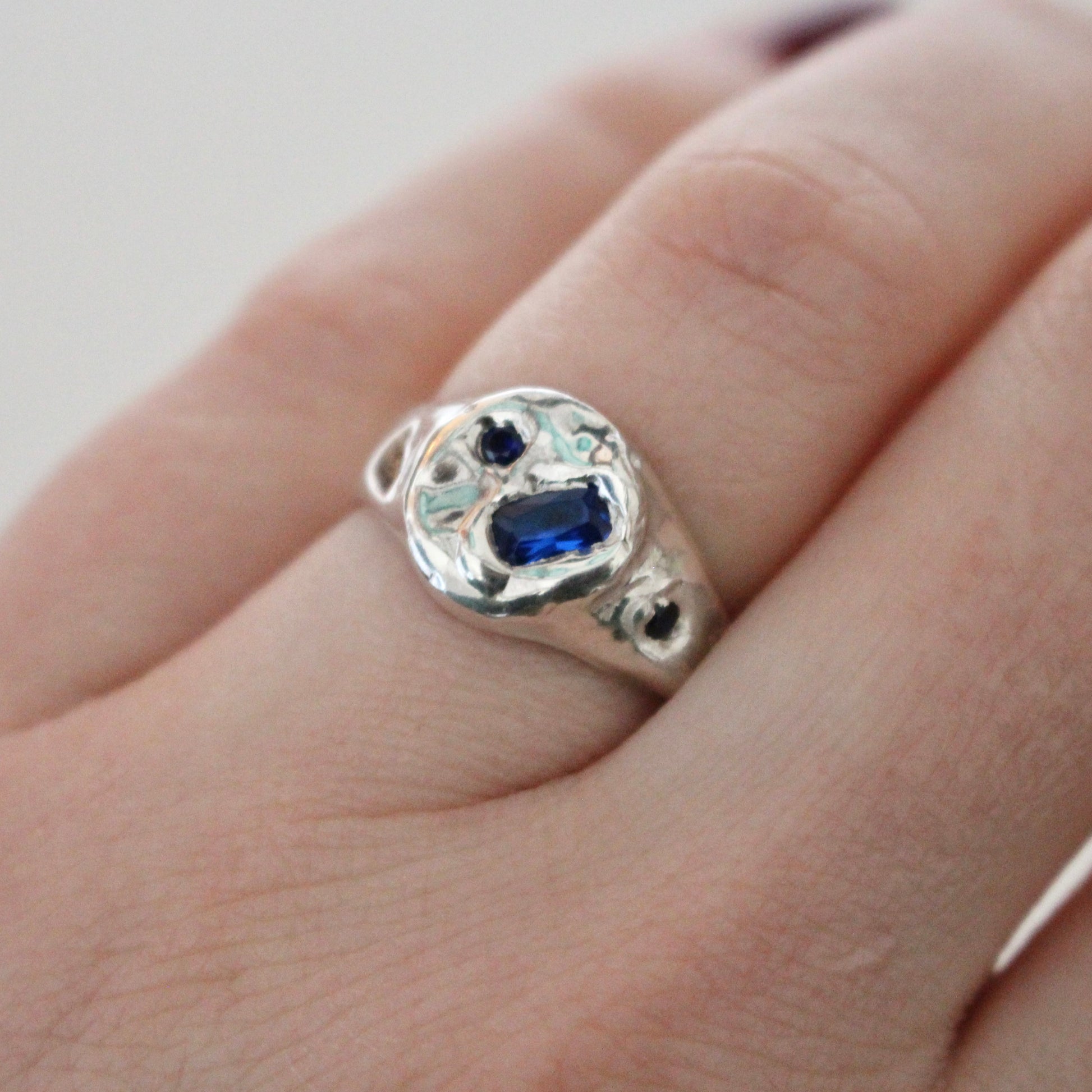 The lagoon ring is handmade with three lab grown stones, a radiant cut spinel and two lab grown round sapphires.