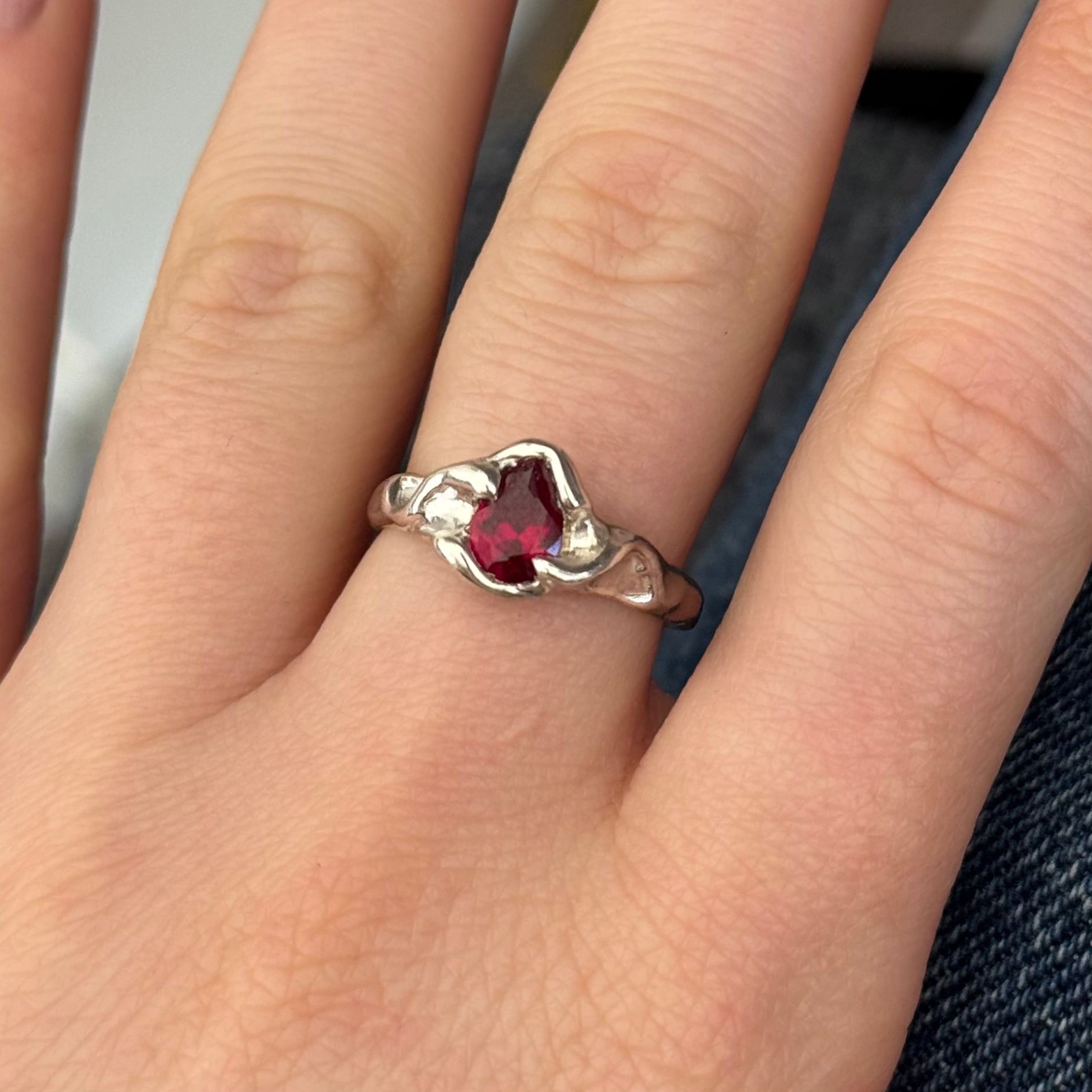 Handmade sterling silver ring with a lab grown ruby.