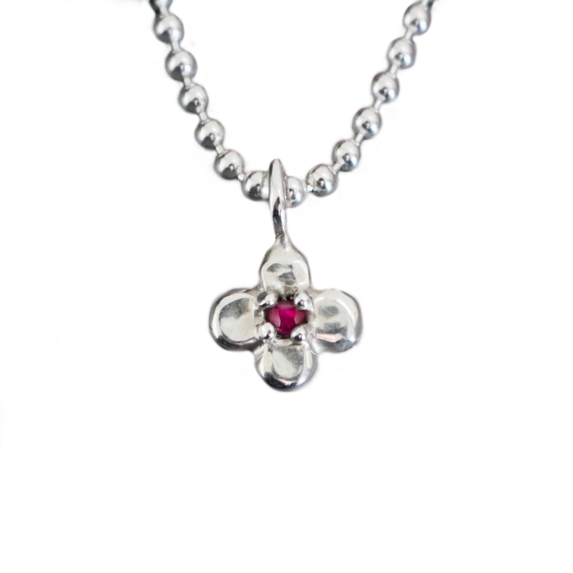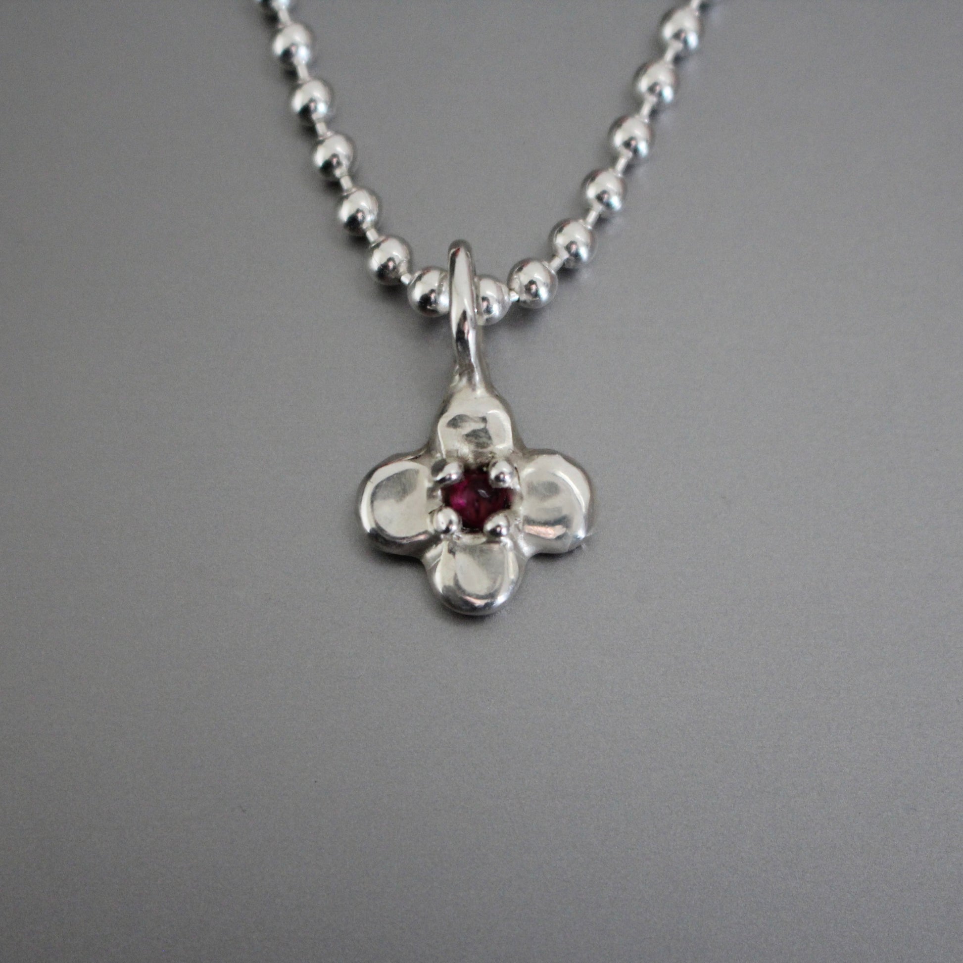 The pollen necklace is a continuation of the pollen ring, handmade in sterling silver with a lab grown ruby cabochon on a silver ball chain.